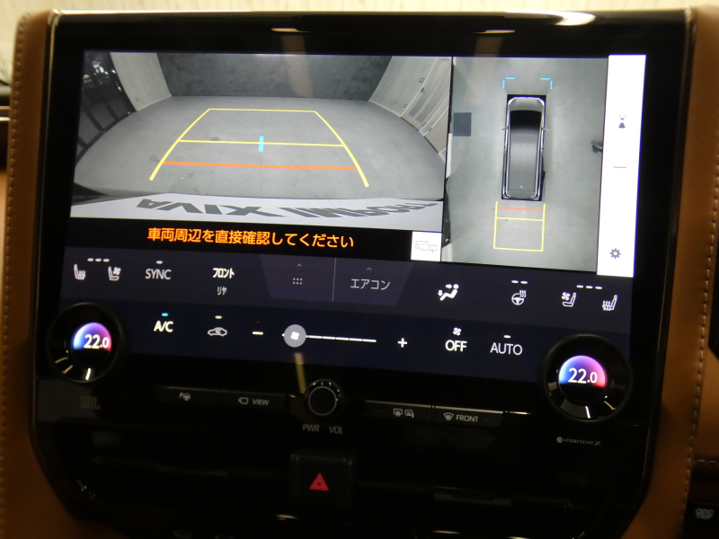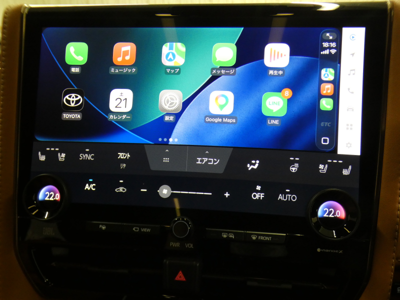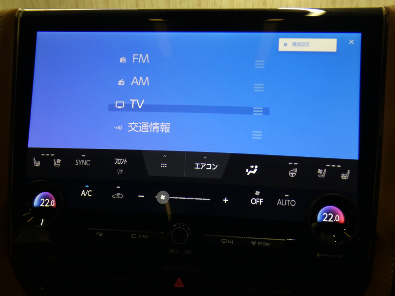 14インチリヤシートエンターテインメントシステム、HDMI入力端子(センターコンソールボックス内部1個)(+センターコンソール後部1個)、ディスプレイオーディオ(コネクティッドナビ対応)Plus(ナビ:(コネクティッドナビ対応(車載ナビ有)、FM多重VICS)、オーディオ・ビジュアル:(14インチHDディスプレイ、AM/FMチューナー(ワイドFM対応)、TV(フルセグ)、USB入力(動画・音楽再生/給電(Type-C))、スマートフォン連携:(Apple CarPlay対応、Android Auto対応、Miracast対応)、T-Connect:(マイカーサーチ、ヘルプネット、eケア、マイセッティングなど)、その他:(Bluetooth対応(ハンズフリー/オーディオ)、ETC2.0ユニット(VICS機能付)+光ビーコンユニット付(JBLプレミアムサウンドシステム(15スピーカー/12chオーディオアンプ)