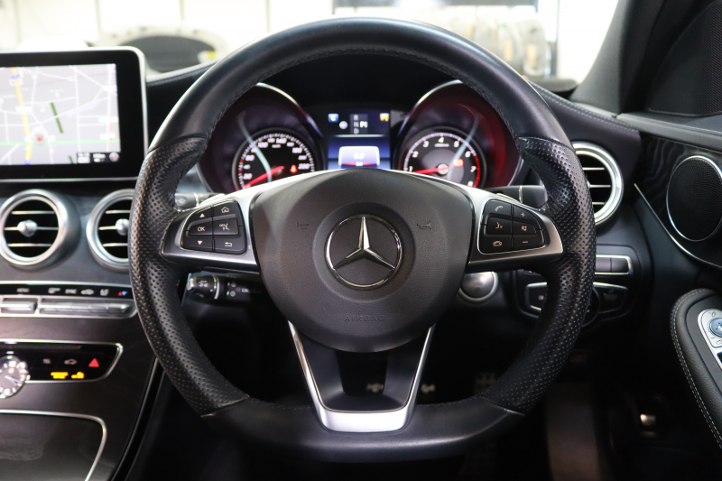 メルセデスベンツ Cクラス C200ステーションワゴン スポーツ レーダーセーフティPKG 中期 1オーナー 黒革 純正ナビTV BT音楽 バックカメラ PTS LEDライト 自動Rゲート AMGエアロ&18AW ダイナミックセレクト エアサス 9AT 2年保証