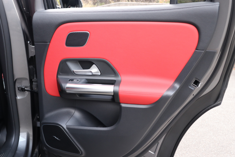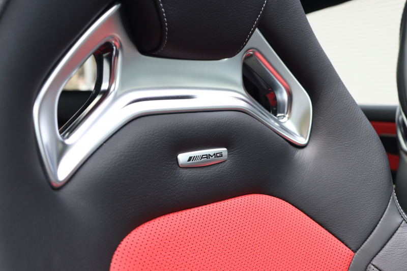 インテリアは本革シート(クラシックレッド/ブラック)を中心に、スポーティで上質な空間に仕上げられています。AMGパフォーマンスシートやAMGパフォーマンスステアリング(ナッパレザー/DINAMICA)、カーボン調インテリアトリムがAMGらしい世界観を演出。さらにシートベンチレーター・シートヒーター・ヘッドアップディスプレイ・パノラミックスライディングルーフなど快適装備も充実。